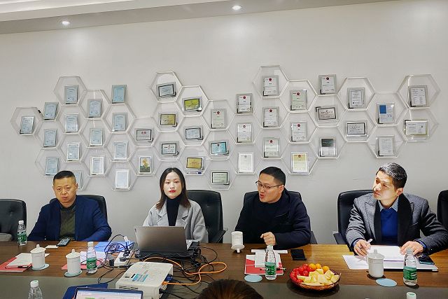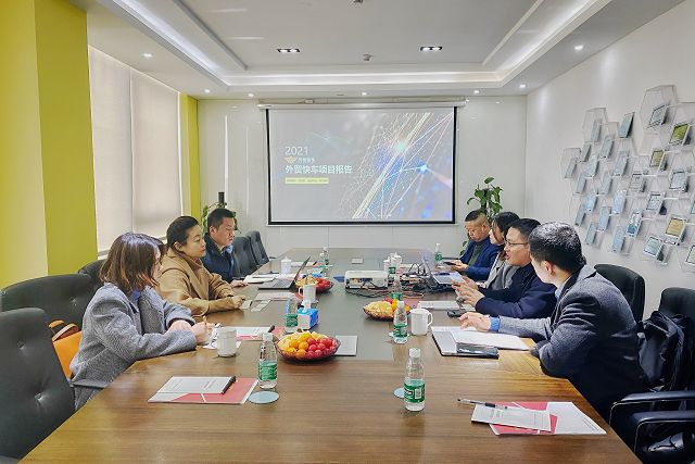 随后,杭州市富阳区商务局电子商务科的领导与企业代表,在公司会议室展开洽谈。会上,首先通过简短的视频介绍了思亿欧的整体情况,接下来由培训部经理周萍女士,从外贸快车的发展历程、运作模式、创新开发、客户反馈等方面详细介绍了外贸快车,同时着重介绍了最新上线的外贸快车直播系统,来访领导们对外贸快车的创新型直播系统也表示了赞赏。期间,企业代表与何总、徐总展开友好交流,双方在许多理念上互通有无,为外贸快车更好的发展提供了宝贵意见。